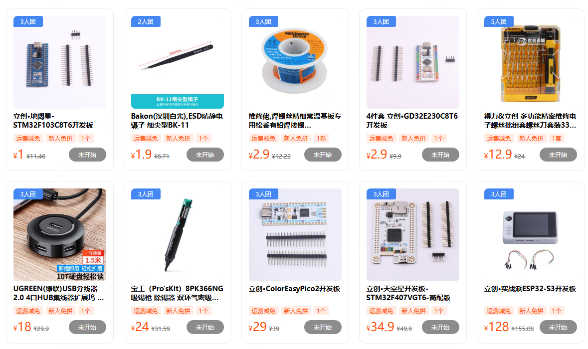 来到4月11日超级会员日当天,我斗志昂扬准备大干一场!多人团可是我必冲的项目,毕竟开发板只需1元是真香!当然这里的通用工具耗材也不少,像焊锡丝这种我都是闭眼囤。多人团人数一般只需2-5人,轻松无压力。