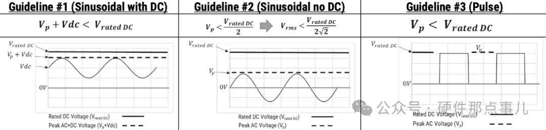 当交流电压叠加在直流电压上时,总电压(Vp+Vdc)必须小于MLCC的直流额定电压。如果施加瞬态或脉冲电压,则电压必须低于MLCC的直流额定电压。
