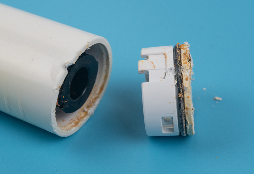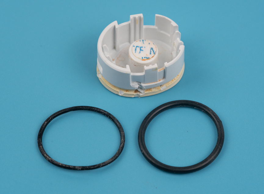 拆解的第一步,依然是从底部撬开,已经沾染上脏东西的牙刷,并不值得小心翼翼保留全柿,只需要大刀阔斧快刀斩乱麻。拆开之后看到黑色的O型防水圈上的五年老泥巴,就能猜出这个牙刷里面有多脏了。