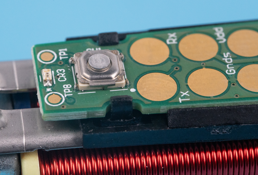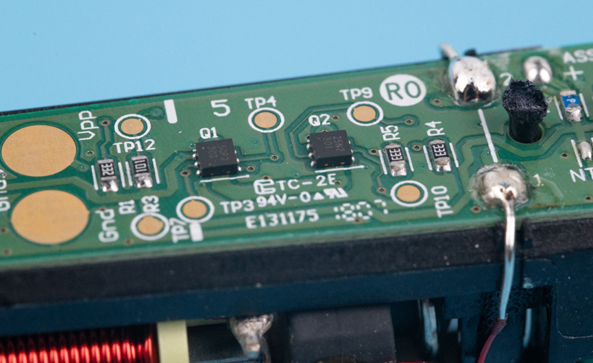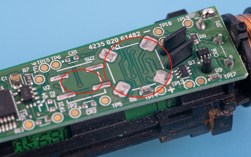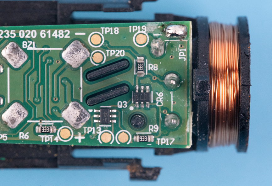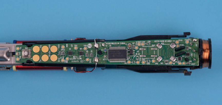 尾部是充电接收端线圈,焊接在电路板上,然后通过两个SOT23-6的器件完成了整流,这部分电路,男主人以前拆解另一款飞利浦电动牙刷的时候有过仔细的分析,可以跳转过去看看(文章链接:)