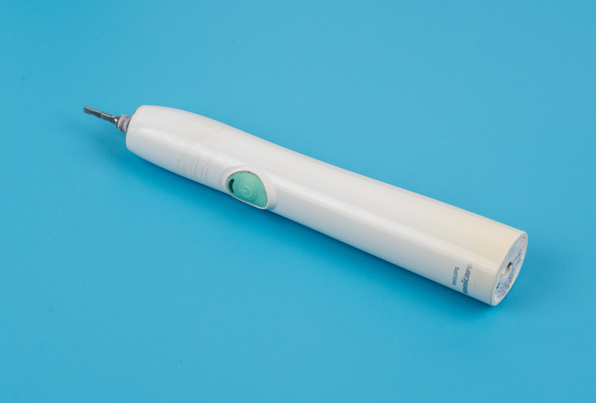 事实上这个牙刷已不再年轻。看着这个刷头上已经清洗不掉的发霉痕迹,其实男主人早就有拆解这个电动牙刷的想法,只是迫于女主人的营威,不能遂了心意。这次终于有神秘东西相助,得以拆解。