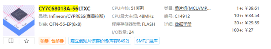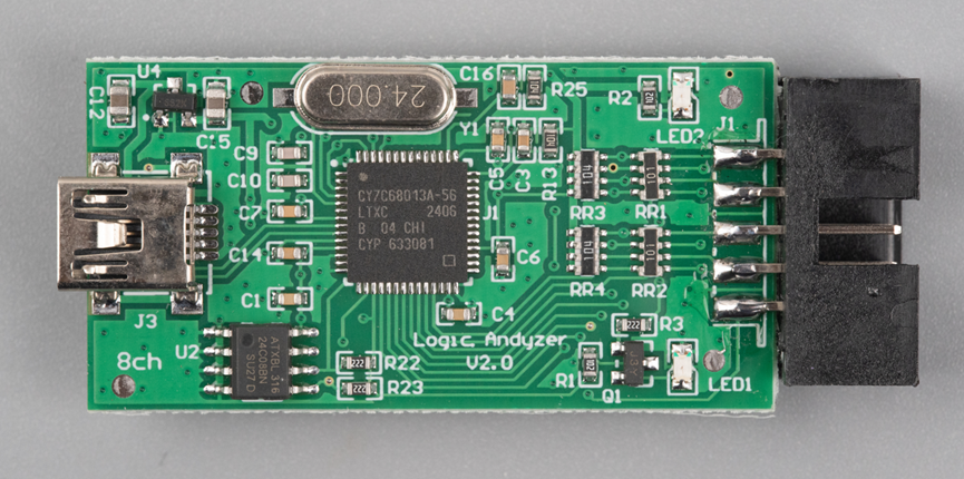 拆解看看电路板,用的芯片是赛普拉斯的CY7C68013A-56LTXC,这是一个51内核的,带高速USB控制器的单片机,最大主频48MHz。