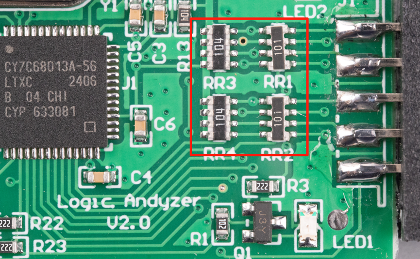 从这里来看,8个输入通道的信号进来之后,经过串联的100欧电阻之后,进入到CY7C68013A芯片,同时在这个节点上还加了一个100K的上拉电阻。