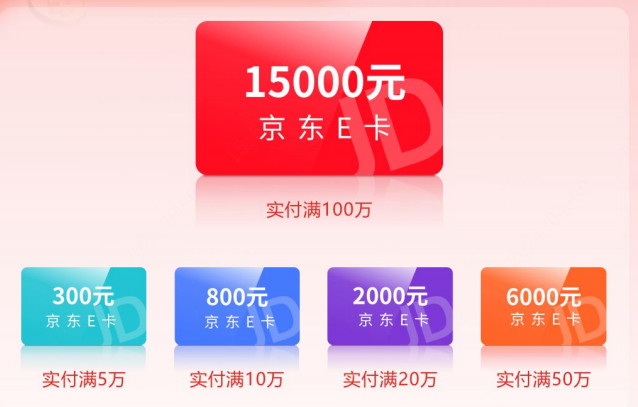 4月备货周活动期间,符合下单规则的订单,累计商品金额达到以下门槛可返京东卡,最高返15000元E卡!