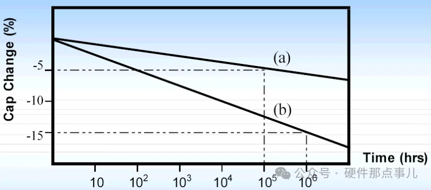 电容容值随时间下降是对数关系,在对电容进行去老化后,电容容值在去老化的前1000小时内下降最为显著。在此之后电容容值会比较稳定,尽管如此,从产品可靠性的角度来看,目前产品的寿命一般都会超过1000小时,所以在进行电容选型时,还是要仔细考量。