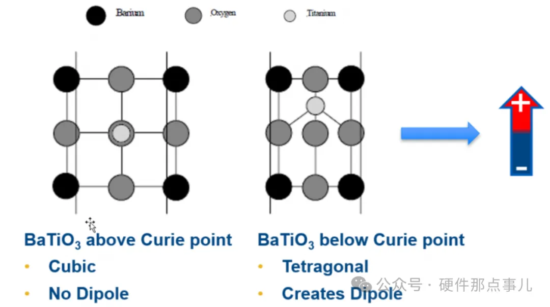 II类MLCC由铁电材料制成,你可以想象一下,II类电容的电介质材料内部有很多电偶极子组成,这些电偶极子是有方向的,电容的容值会受到电偶极子排列方式的影响。而电偶极子排列方式又会受到时间、温度、电压的影响,从而会影响电容的介电常数。