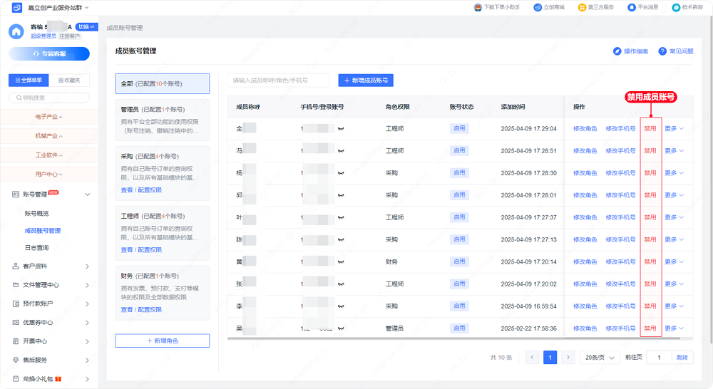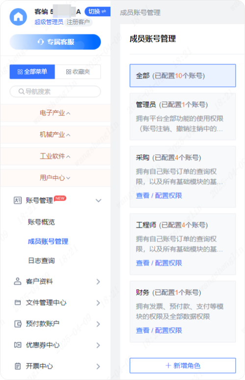 母账号还可以通过角色权限分级配置,划分不同岗位操作权限。例如:采购人员不具备工程文件下载权限,工程师不开放财务提现权限等。通过权限隔离,强化企业核心数据与资产保护。