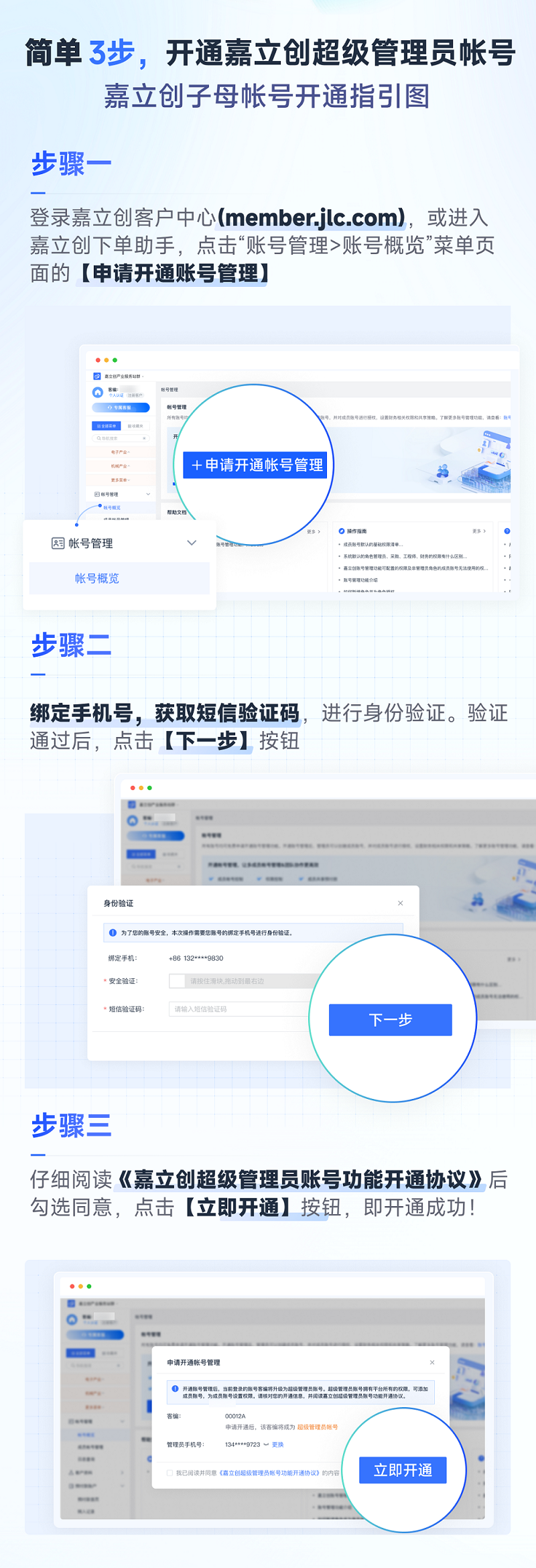 登录嘉立创客户中心(member.jlc.com)或打开嘉立创下单助手,找到【账号管理】功能,仅需简单三步即可开通。详细操作指引请见下图,或扫描上方二维码进群咨询: