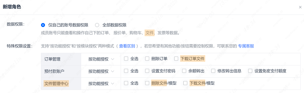 母账号统一管控所有子账号,精准配置操作权限。例如:限制成员账号仅可查看自己账号的订单信息,从而规避公司所有项目数据全面泄漏的风险,保障公司信息安全。