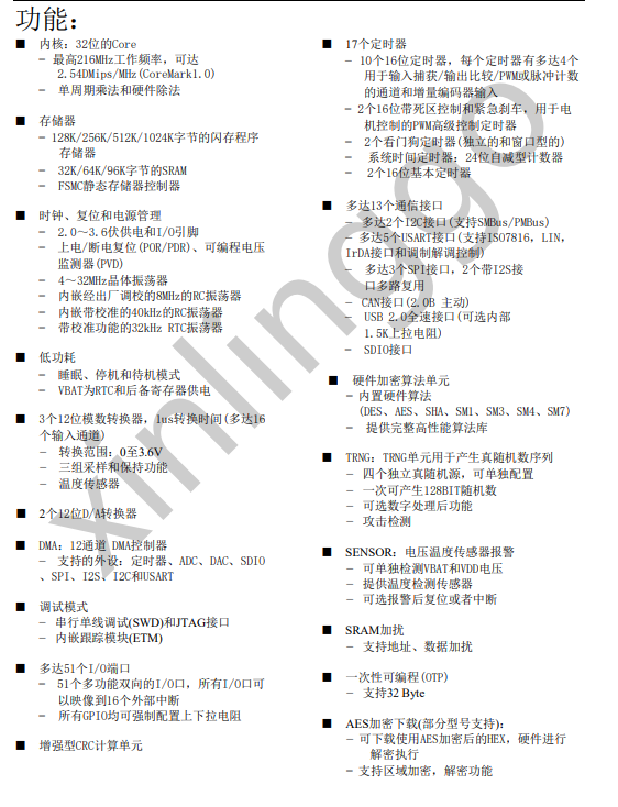 MH32F103Axxxx系列工作于-40℃至+85℃的温度范围,供电电压2.0 V至3.6 V,省电模式保证低功耗应用的要求。
