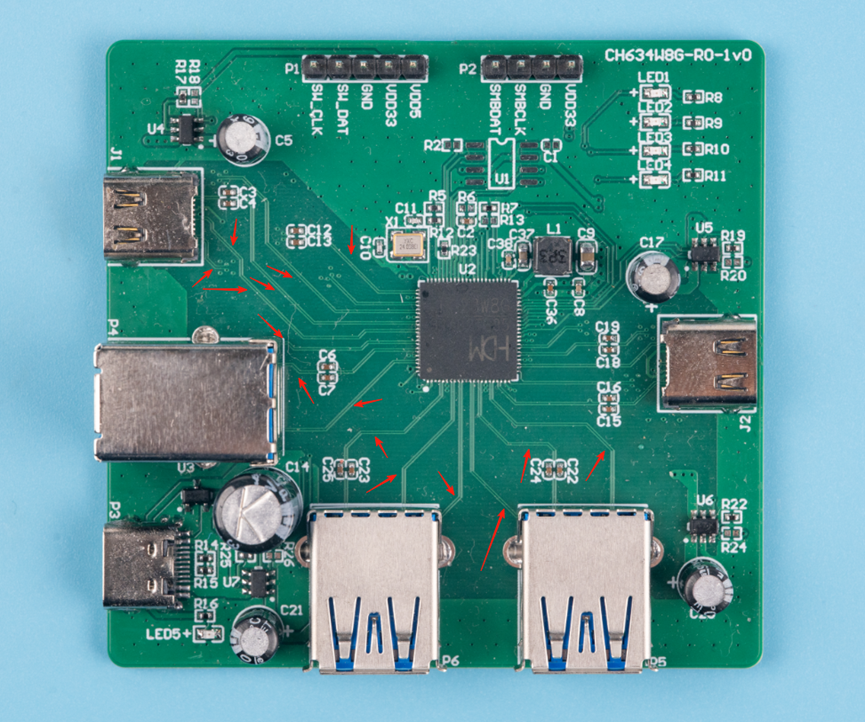 这是我在沁恒的USB扩展板DEMO上看到的,从一个USB3.0口阔展出两个Type-A口的座子和两个Type-C口的座子,我们可以看到,每个Type-A口都有三组信号线,但是为啥每个Type-C口都引过去了六组差分信号呢?