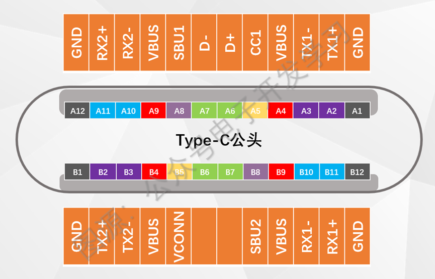 这是Type-C公口的引脚定义。整个接口有四个VBUS引脚,四个GND引脚,每边各有一组超速TX和RX差分对,但是和母口的区别就在于,公口只在一侧有D+和D-,另一侧空置。公口一般用在数据线上,用来插入设备端的Type-C母口。