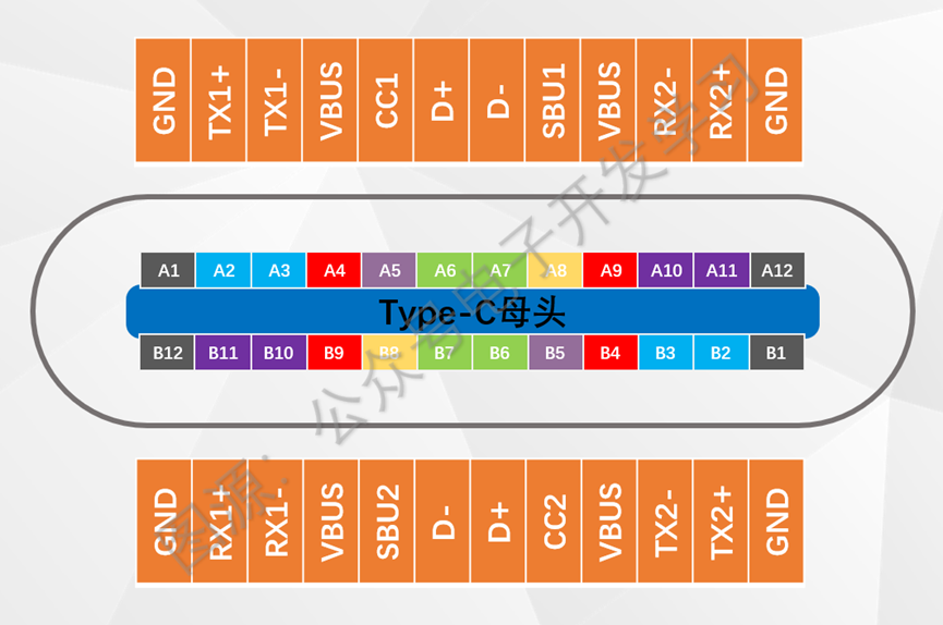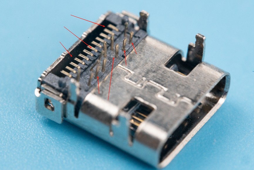 好求甚解的我,仔细看了一下,发现Type-C座子上,除了一排12个贴片引脚之外,还有两排插件引脚共12个,所以说总共有24个引脚,那么这24个引脚是怎么定义的呢?我又开始列文虎克了。