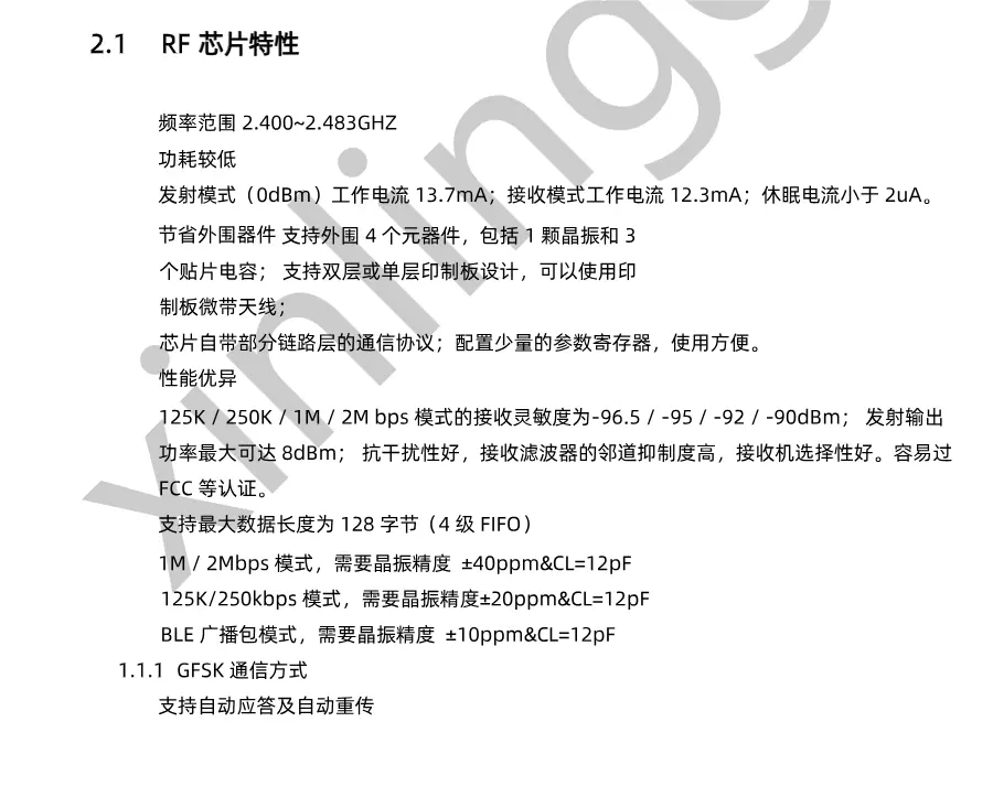 通信方式:使用GFSK(Gaussian Frequency Shift Keying)通信方式。