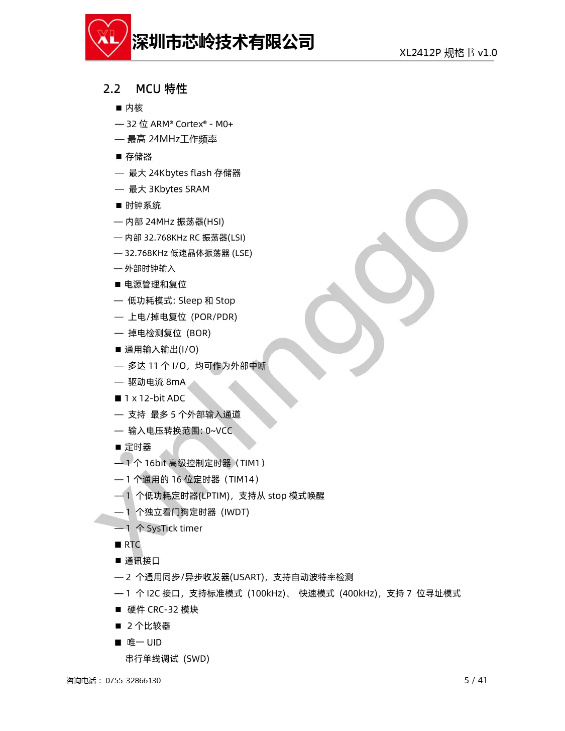 XL2412P芯片内含32位ARM Cortex M0+内核MCU,配备24Kbytes flash 和3Kbytes SRAM存储器,最高工作频率达到24MHz。一颗芯片相当于两颗芯片。MUC集成了多路I2C、USART等通讯外设,1路12bit ADC,2个16bit定时器,以及2路比较器,这些丰富的外设支持使得XL2412P在不同的应用场景都有着很好的应用,如无线鼠标键盘,无线游戏手柄,有源无线标签,遥控玩具,智能家居及安防系统等。