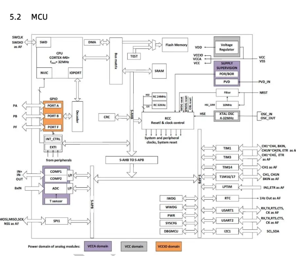 内核:32位 ARM Cortex®-M0+,最高工作频率24MHz。