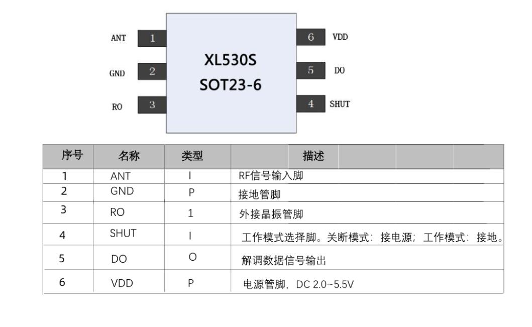 XL530S为 SOT23-6 封装,正常工作电压范围 2.0~5.0V ,正常工作电流 2.8-3.5mA,启动时间 3ms, 接收灵敏度最高可达到-110dBm,非常适合各种低功耗要求的设备以及SOT23-6小封装对于在产品较小尺寸空间上有要求的产品最合适。
