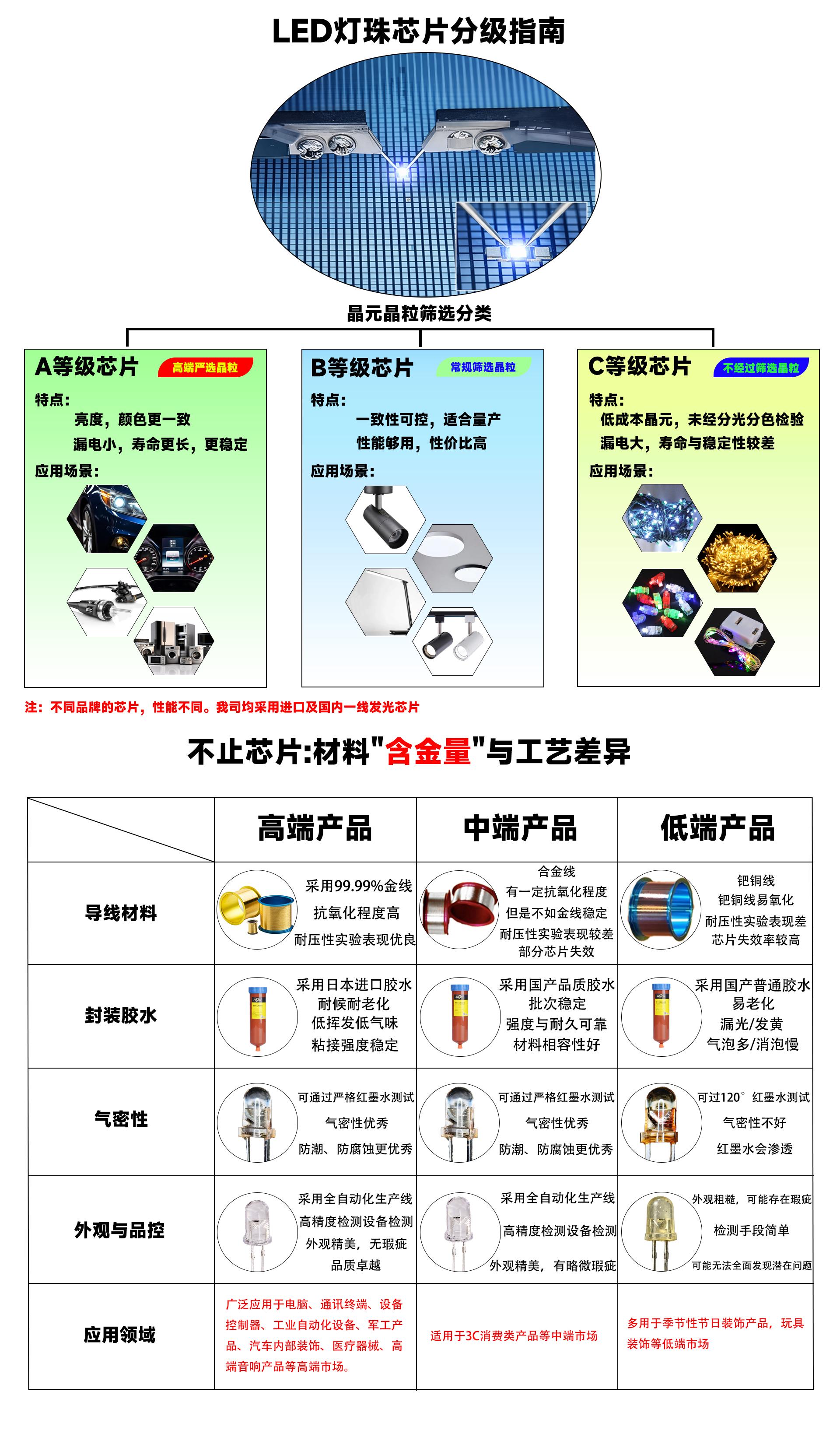 总结不同等级的LED芯片通过差异化的性能和成本定位,覆盖了从尖端科技到日常消费的全场景需求。选择时需结合实际应用对稳定性、寿命及成本的综合考量。