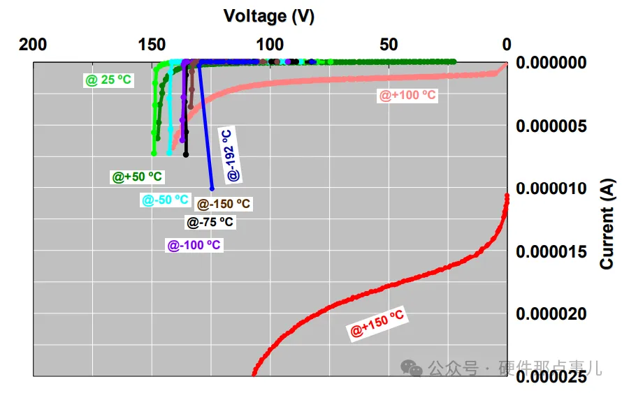 所以我们在规格书中看到二极管的反向电压值,一定要注意确认此电压是在工作温度全范围,比如说-40℃到175℃中规定的反向耐压,还是只限于25℃的反向耐压。一般来说都是后者。这就意味着规格书中只告诉了你25℃的反向耐压,你还需要考虑低温情况比如-40℃时二极管的反向耐压降低了多少?