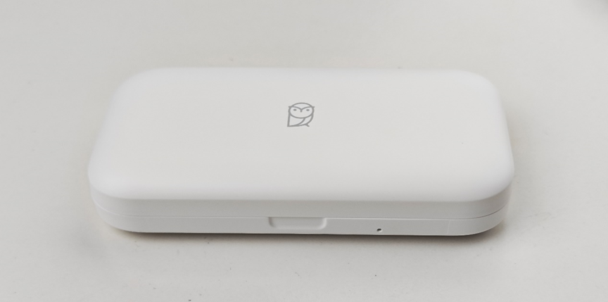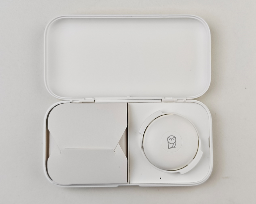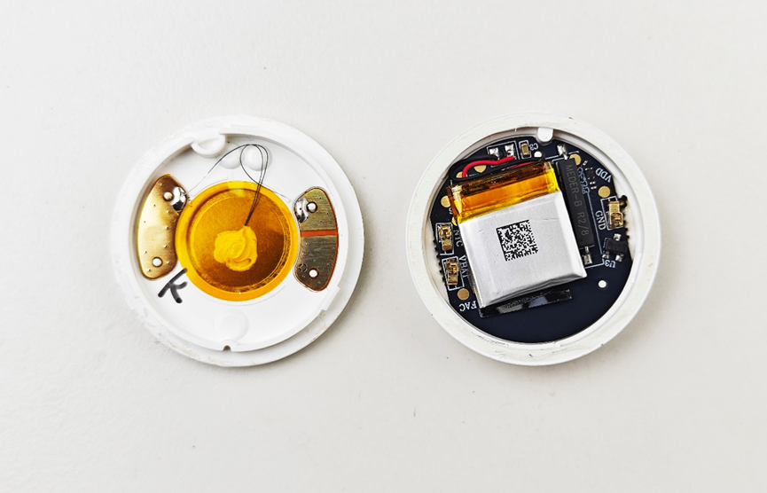 背面是一个金属材质的圆盘,上面有二维码,是用来扫码绑定手机APP的。上下有两个金色触点,看起来是装在盒子里的时候充电用的。一侧有两个小凹点,另一个有一个大一点的凹点,应该是为了装在盒子里的时候卡位的。