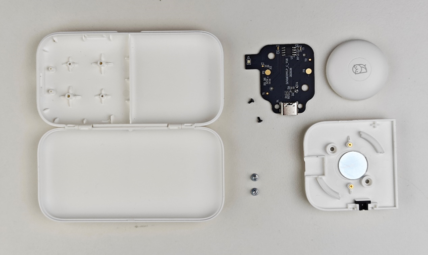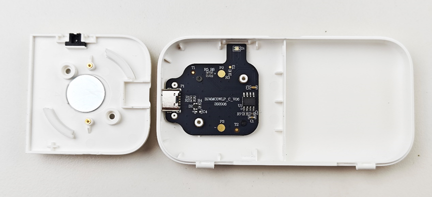 接下来看看盒子里的电路。可以看到里面贴了一个圆形的小磁铁,看来之前的霍尔传感器就是通过检测这个磁体来确认体温计有没有装在盒子里的。相当于一个开关。当体温计检测到被取出了,就开始工作(我猜的)。