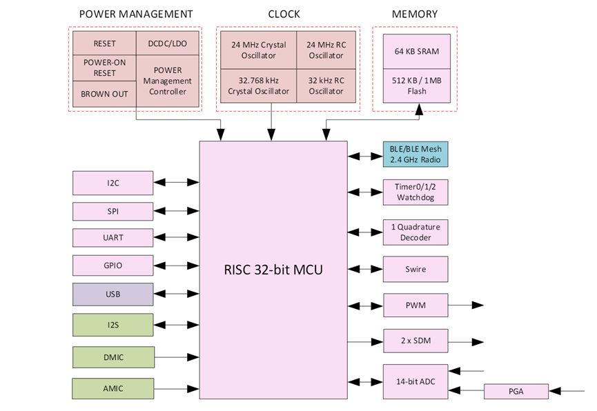 板子正面的QFN32封装的器件是主控芯片,型号为TLSR8250F512,这个芯片是泰凌微的BLE SOC,内核是RISC,芯片内部框图如下。