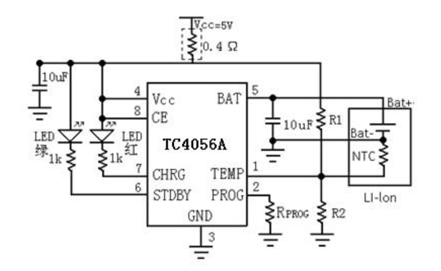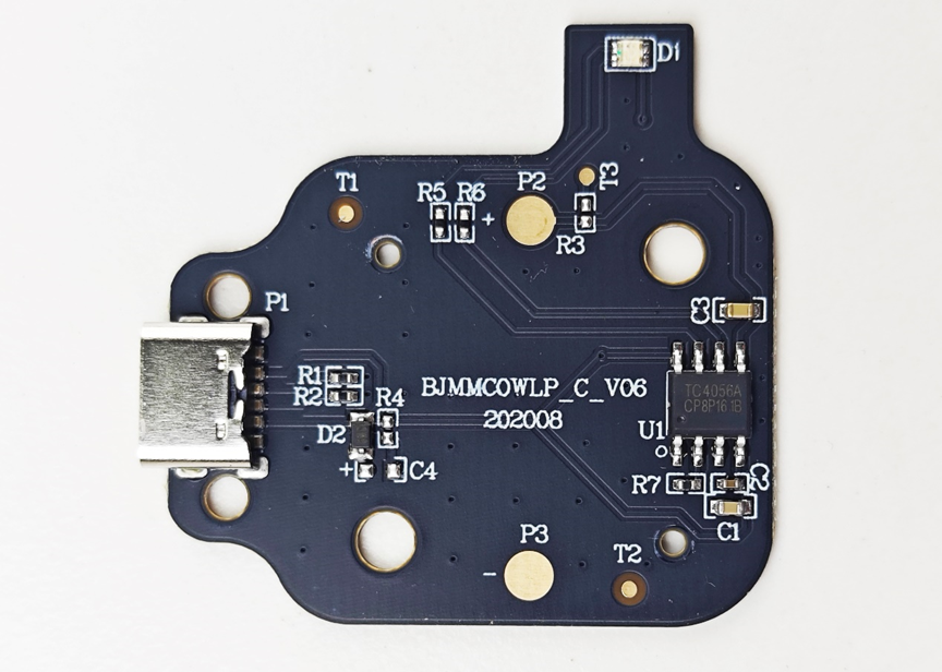 一个Type-C口用来充电,板子上这个SOP-8封装的器件丝印是TC4056A,应该是来自富满的一颗锂电池1A充电芯片。该芯片内部集成了PMOS,不需要外部加隔离二极管防止倒充电。数据手册里的配图不是很清晰。