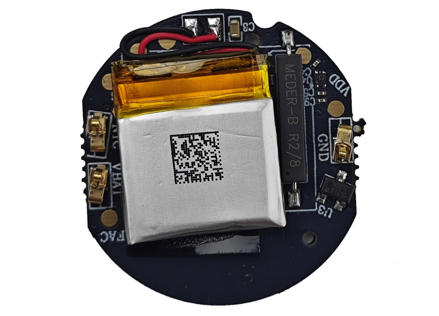 可以看到贴宝宝身体这一面是一个类似热电偶的测温元件,然后通过很细的丝连接到了两旁的金属片上。PCB板上有对应的弹簧触点,两个壳安装在一起之后,信号就传导到了电路板上。