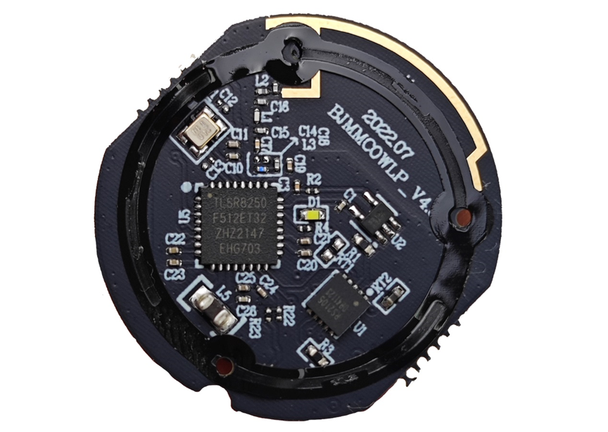 板子靠近右边缘的位置还有一个SC70-5封装的器件,丝印是321BK。根据这些丝印找到应该是RS321BKXC5。这是一颗1MHz带宽的轨到轨输入输出的CMOS运算放大器。该器件用来放大温度传感器的模拟量到蓝牙SOC的ADC可以处理的范围之内。