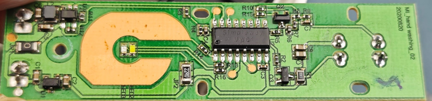 上面这个SOP-16的器件丝印是Simplewey MW01,这应该是一个MCU,右边的两个三极管是红外发射驱动和红外接收检测,用来检测人手。上面大的裸露焊盘,是一个触摸按键,对应洗手机顶部的米家LOGO的那个开关机按键。