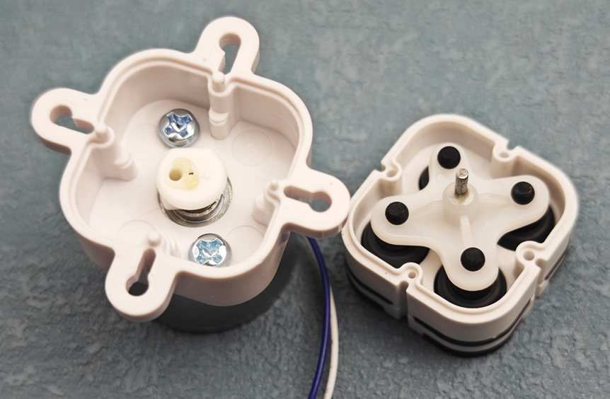 可以看到左边的电机出轴带了一个偏心联轴器,右边是一个十字形的结构,固定了四个胶皮碗,当电机转动时,带动这个十字形的结构离心转动,从而轮流对四个胶皮碗进行吸气、压缩、排气的三冲程。气应该是被排到洗手液经过的通道了,这样就可以把洗手液吹成泡泡了。为了验证猜想,看看右边这个件是怎么和洗手液流经的通道连接的。