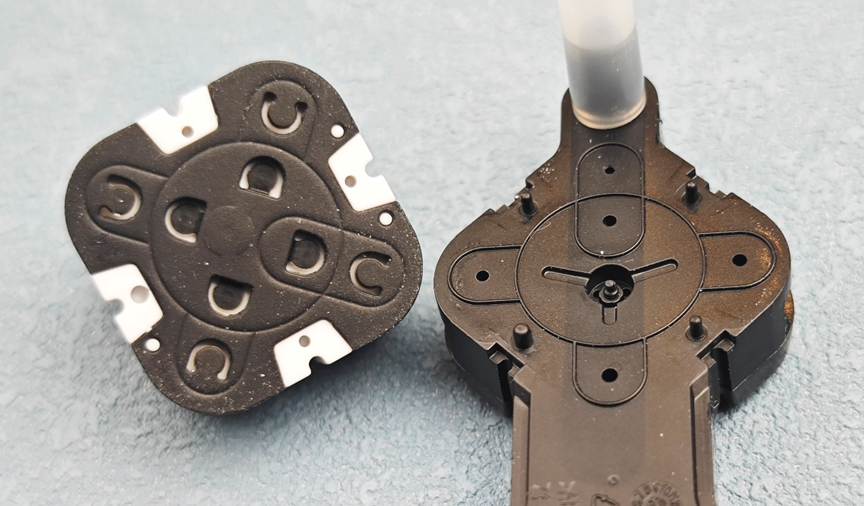 发现这四个出气孔的位置有四个半圆的橡胶片,这个应该是在吸气的时候可以堵住这边,排气的时候就可以吹开这个橡胶片,原理和二极管类似。另外需要注意的是,左边结构中间的圆形凸起,和右边结构的出轴,都不在这个件的几何中心,为了避免安装方向错误,上面的四个安装导向柱中有一个比其他三个粗,这样就可以保证安装的时候不会安错了。