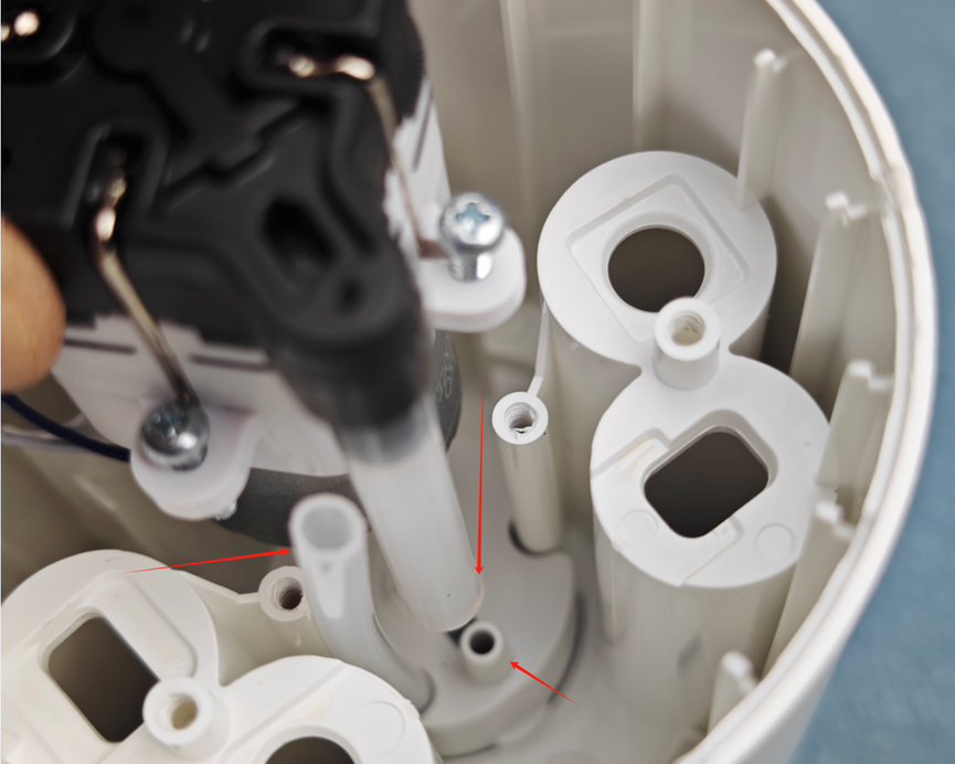 拔掉这两个插线,先研究一下下面这个出泡泡的是个啥机构。拆掉螺丝稍微掰了掰就拿下来了,要掰一掰的原因是,在出泡泡的位置有点胶,白色的。