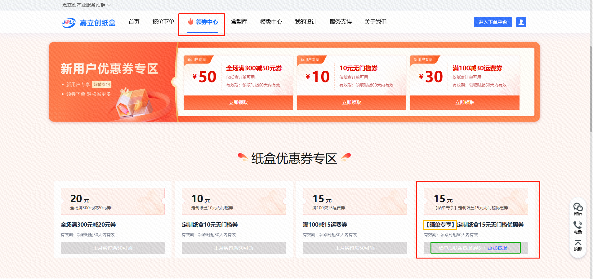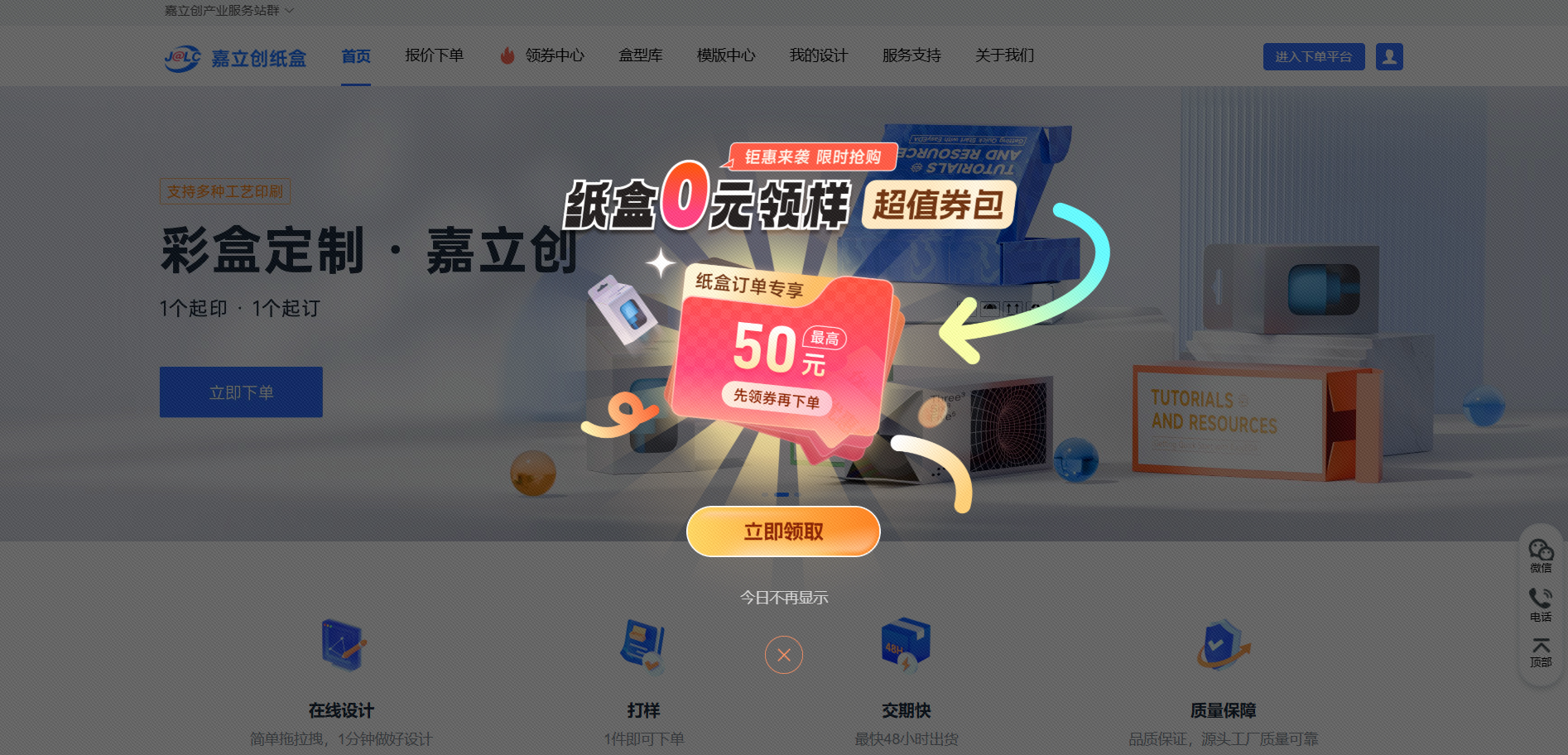 - 登录即提醒:访问嘉立创纸盒官网自动弹出未领取优惠券;