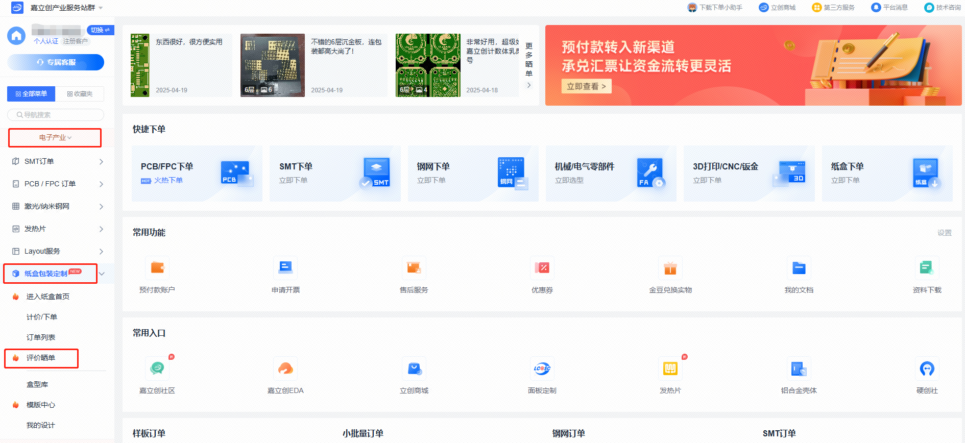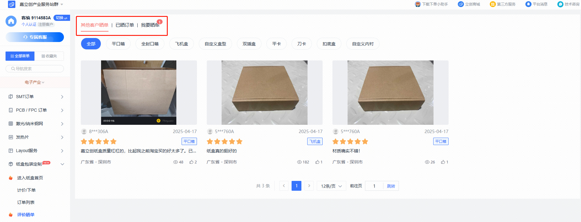 1、晒单路径:嘉立创下单平台 → 电子产业 → 纸盒包装服务 → 评价晒单