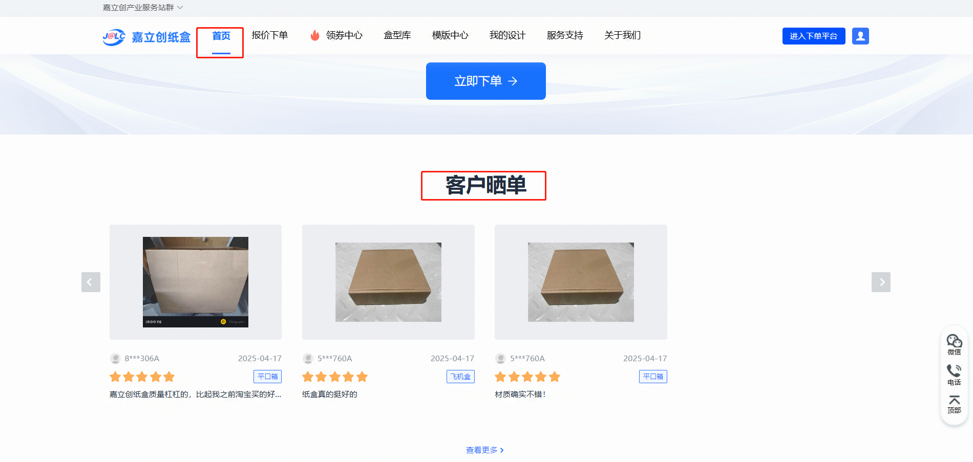 3、审核通过的晒单内容,将展示在嘉立创纸盒官网首页的【客户晒单】专区。