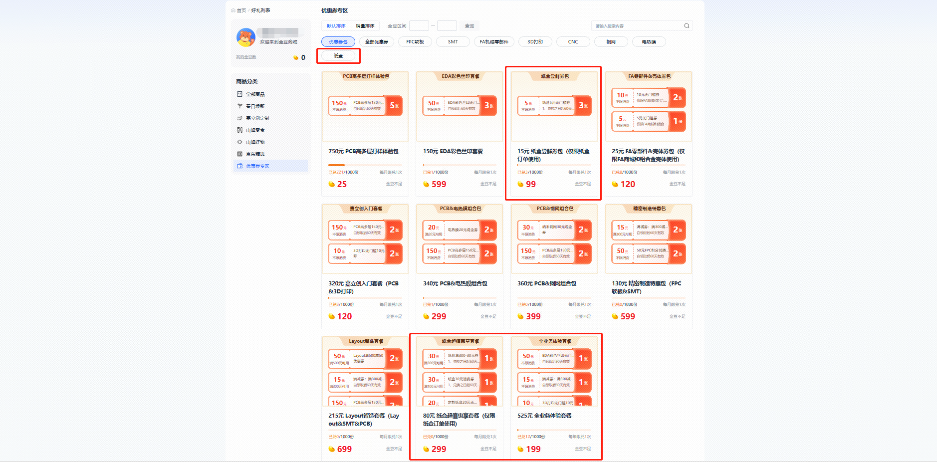 担心优惠券不够用?别着急,嘉立创金豆商城来帮忙!金豆商城同步上新了3款超值的纸盒优惠券包套餐,用户可根据自身需求进行兑换。