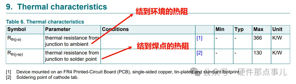 规格书中出现了两个热特性参数,分别是Rth(j-a)和Rth(j-sp),Rth(j-a) 是结与环境温度之间的热阻 (°C/W),Rth(j-sp)是结和焊点之间的热阻 (°C/W),关于这两个特性参数的使用,在之前的文章中已经介绍过,大家可以查阅这篇文章:硬件工程师需要学会的用热阻Rth(J−A)和瞬态热阻rth(J−A)计算二极管温升的方法(1)。需要注意的是厂家给出的热阻参数都是在特定的条件下测出来的,比如PCB的材料FR4,PCB的层数,单层板,以及采用二极管标准封装,当然和PCB的尺寸也有关系,不过这个规格书中没有标准测试用的PCB的尺寸,所以厂家给出的热阻参数我们可以拿来参考,但是会有偏差,偏差的大小取决于我们自己实际设计的PCB的厂家的PCB的差异,所以这个参数只是有参考意义。