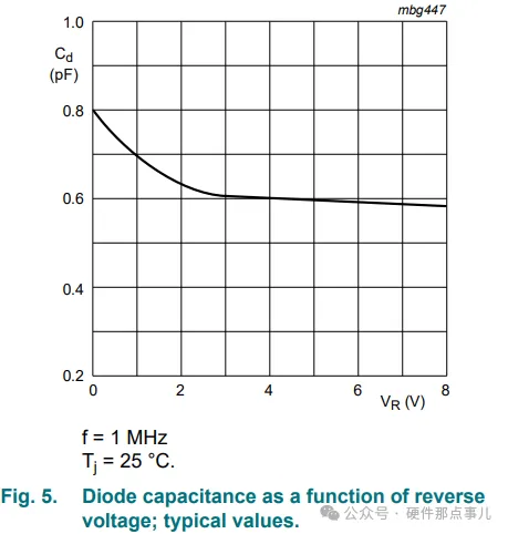 Cd:二极管结电容是在阳极和阴极之间施加反向电压时二极管端子之间的电容。由于二极管结电容的存在,当工作频率超过某一值时,它的单向导电性将变差。在高频线路中结电容过大会造成容抗很低,可能旁路二极管。同时二极管从导通状态向截止状态转变时,为什么不能马上转换为截止状态呢?原因就是结电容的存在,这里不展开说,后面单独写文章分析。Cd和反向电压有关,反向电压越大,Cd越小。