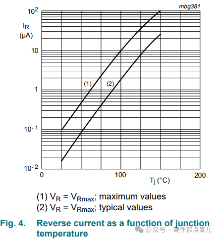 IR:反向漏电流是当在二极管上施加指定的反向电压时从阴极到阳极反向流动的电流。IR取决于温度,随着结温(Tj)的增加而呈指数增加。肖特基二极管和快速恢复二极管比常规的硅整流二极管具有更高的IR。因此,在高温和高压条件下,反向功耗的增加可能会导致器件损坏。因此,当二极管用于大功率高频整流应用时,二极管在进行热设计计算时,同时考虑正向和反向功耗。