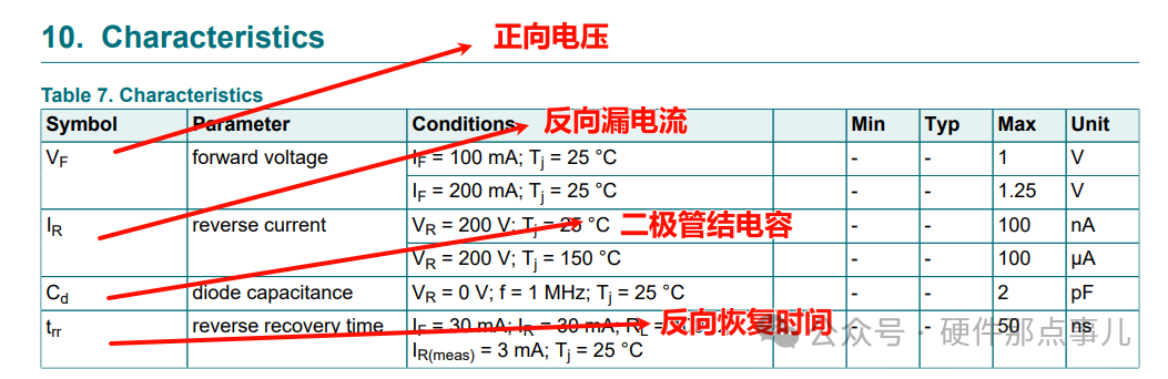 有些工程师常常把Limiting values和Characteristics搞混淆,Limiting values是在极端条件下考虑的,比如温度极端高或极端低、电压过高或过低等情况,Characteristics一般是常温常压条件下考虑,在设计时二极管的电气环境一定不能超过Limiting values的限制。