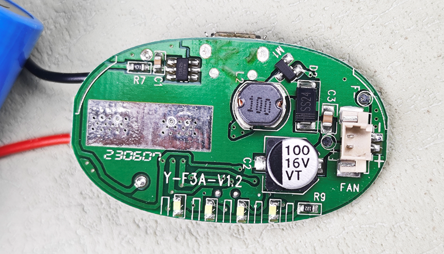 板子背面,下边缘处有四颗LED指示灯,本来是由四档风速的,但是不管在哪个挡位,四个灯好像都会亮。右上角这个SOT23-6的芯片,丝印是R362b,这个芯片的2脚接PCB板的地,3和6脚接锂电池负极,锂电池的正极通过一个470Ω的电阻之后,接到了芯片的5脚。根据连接方式来看,似乎是一个锂电池保护电路,把锂电池保护芯片和两个NMOS集成在了一起。