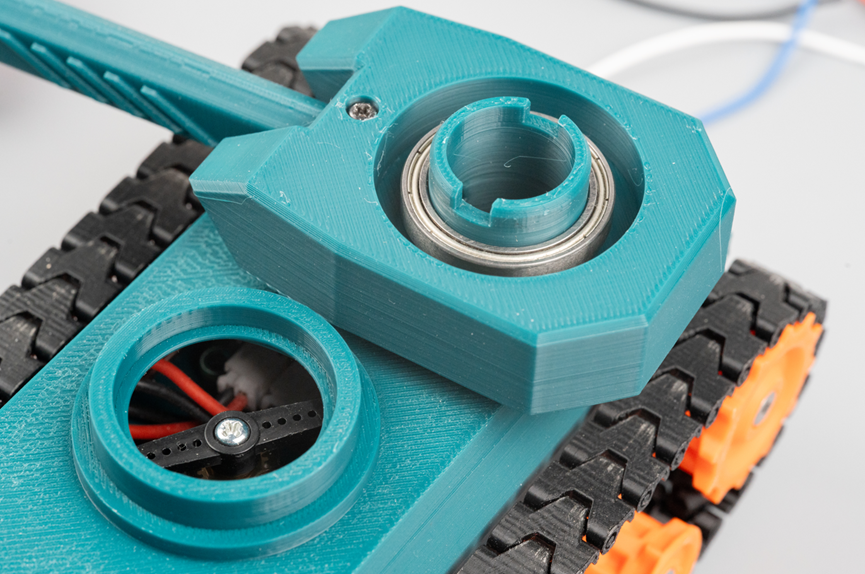 接下来是炮塔的安装,炮塔和坦克车身之间通过一个轴承连接,这样炮塔可以被舵机驱动着转动。