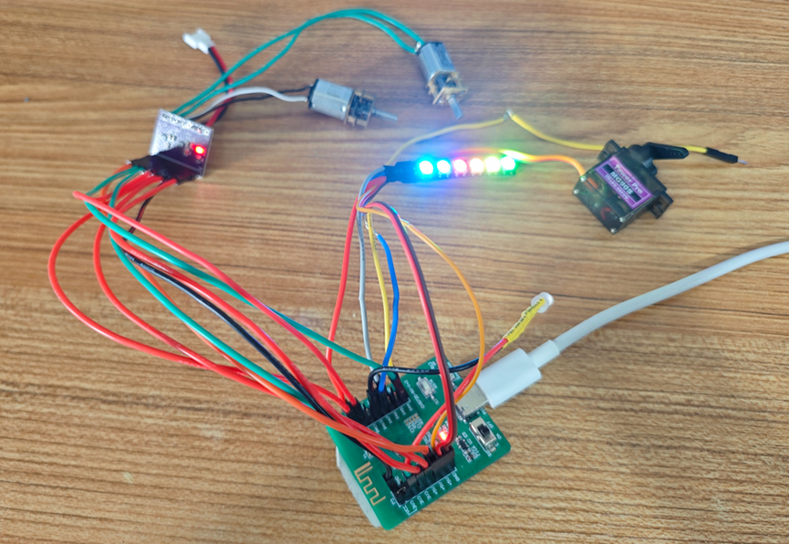 用沁恒官方的CH572D demo板,简单测试了一下,发现蓝牙和手机APP通信很OK,而且芯片总共可以输出4路PWM用来驱动减速电机,还有一个定时器可以用来驱动舵机,一路PWM输出用来驱动WS2812灯带。于是我基于这一套,完成了整个坦克的IO分配和控制逻辑编写。