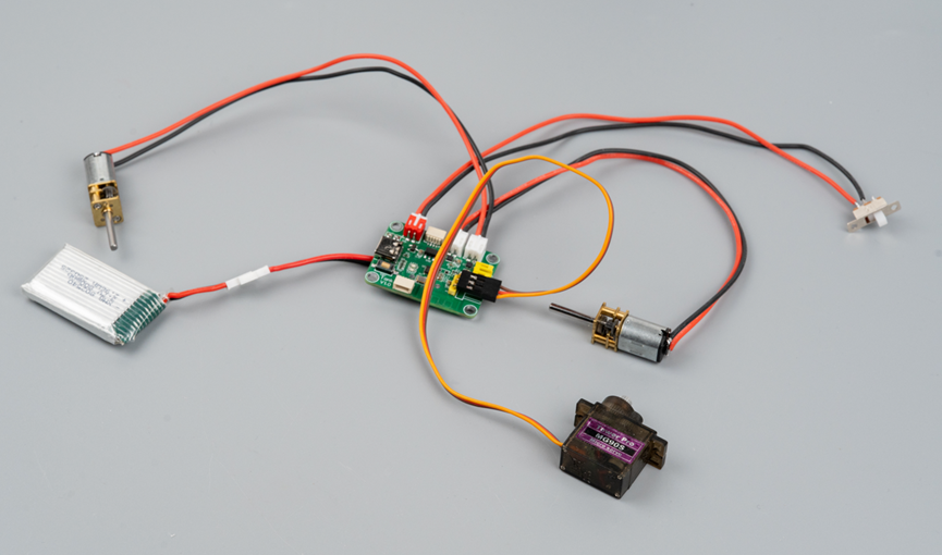 测试板子没有短路之后,给板子下载固件。然后把2个N20直流减速的电机、舵机、开关、锂电池都插到板子对应的连接器上。