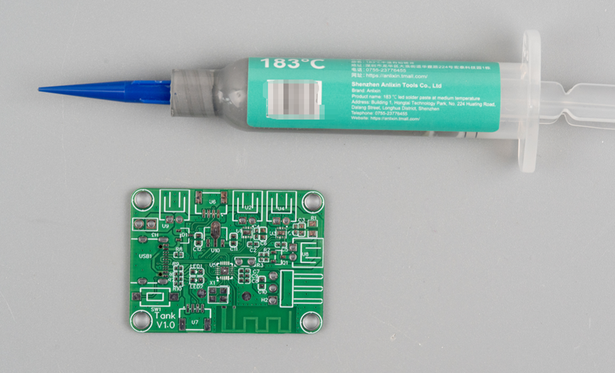 开始焊接,样片的焊接也要贯彻最低成本的理念,连钢网都不要做,直接手工用针管锡膏给焊盘上点锡,这个过程看着挺慢,其实这个板子一两分钟就能完成点锡。如果做钢片,得画15块钱不说,操作过程可能也需要好几分钟了。