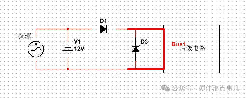 前提条件:电源系统为12V系统,电路图如下图,干扰脉冲为ISO 7637中的5b测试脉冲,D1为二极管,二极管正向导通压降为1V,在电路中的作用是防反接,D3是TVS管,在电路中主要钳位正向脉冲,可以把电路中的高压脉冲钳位到40V。