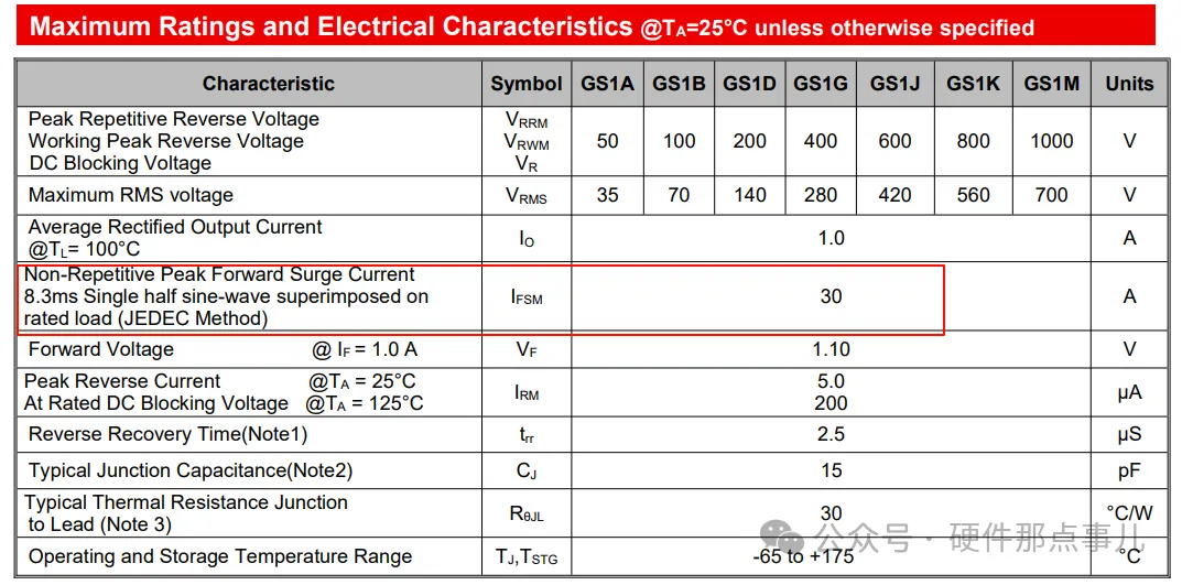 二极管参数校核:我们以下图中GS1M二极管为例,其IFSM电流为30A,有些同学一看到30A,就觉得30A大于29.5A,那这个二极管肯定没问题呀。并不是这样去对比的哦,原因是二极管此处给出的IFSM电流的测试波形是:非重复峰值正向浪涌电流8.3ms叠加在额定负载上的单个半正弦波,也就是这个波形是半正弦波,实际的测试波形是指数波,我们还需要转换一下才能对比。