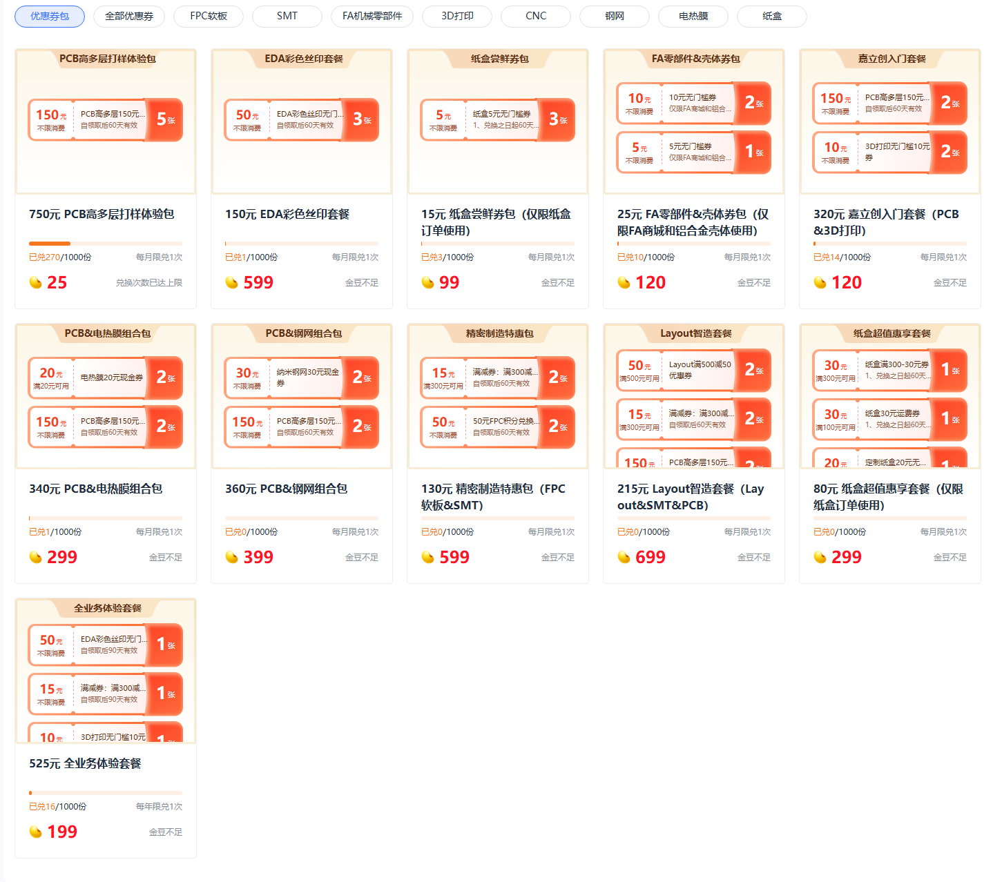PCB/3D打印/SMT/FPC/EDA彩色丝印/FA/CNC/Layout/纸盒/电热膜/纳米钢网/钣金/手工复模......业务全场景配齐,更有199金豆嘉立创13个业务集合优惠券包,带你体验嘉立创超超超全业务线。