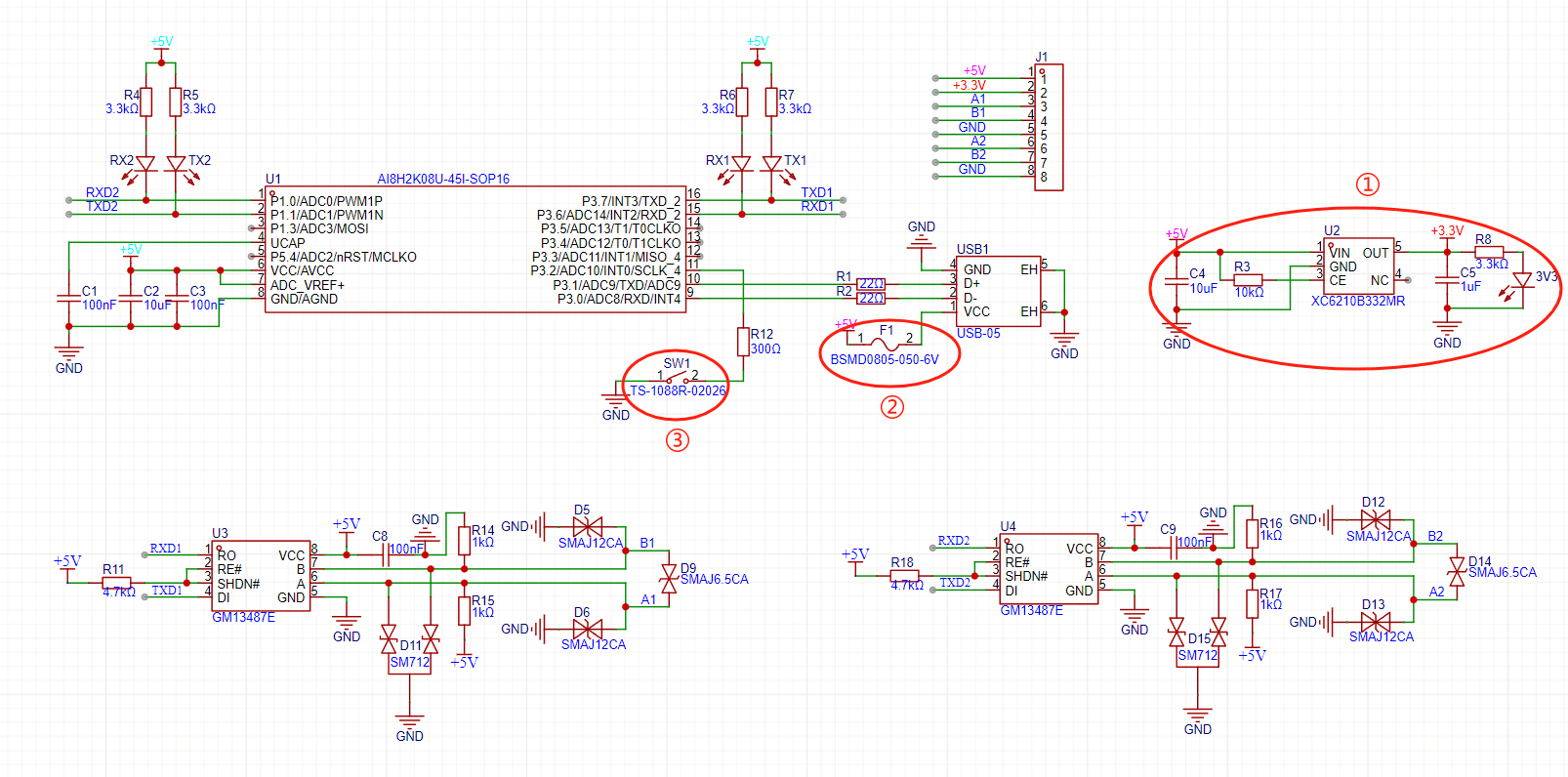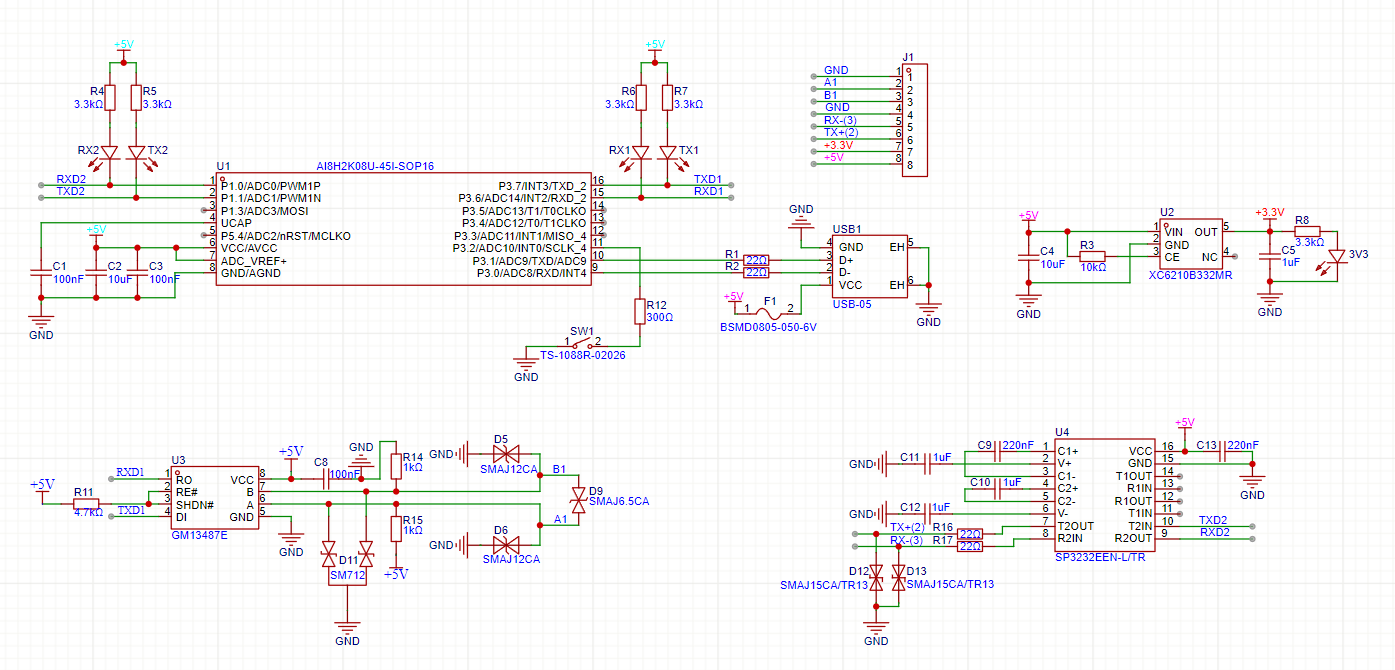 同样的,RS485接口芯片采用的是GM13487E,RS232接口芯片采用的是SP3232EEN。其他部分跟USB转2路485的电路基本一致。